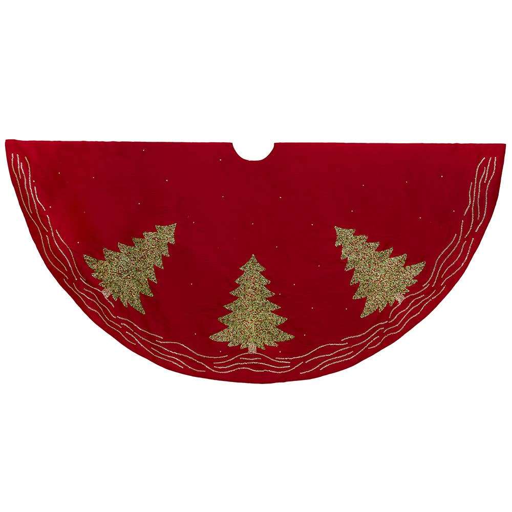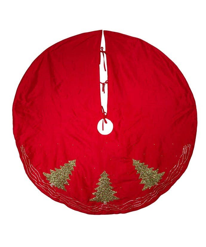 60“RED DUPION W/MULTI SEQUIN TREE EMBROIDERED TREESKIRT.